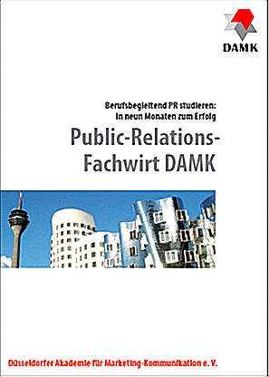Die DAMK Düsseldorfer Akademie für Marketing-Kommunikation e. V. ist die erfahrenste Kommunikations-Akademie im Regierungsbezirk Düsseldorf. Mehr als 2.500 Absolventen sind von hier aus in die Karriere eingestiegen. Auch das Wochenend-Studium Public Relations Fachwirt ist nach der bewährten DAMK-Methode organisiert: Praxisnah, aktuell, kompakt. Die Studierenden erwerben breit angelegte Kenntnisse der Presse- und Öffentlichkeitsarbeit und der Unternehmenskommunikation. Eng vernetzt mit den Grundlagen des Marketing und der Kommunikation vermitteln erfahrene Profis praxisnah sämtliche Anwendungsfelder der Public Relations.